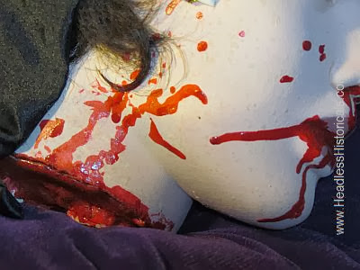 Catherine's facial features are all hand-painted. Her deep brown eyes are glazed over in a cloudy and sickly death stare, framed by soft eyelashes. She is spattered with cast-off blood from the axe blow, and blood running from her mouth and nose. The neck reveals part of the crushed spinal column and severed trachea.